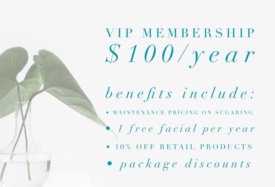 Annual VIP Members receive reduced pricing on all sugaring services, one free facial per year, 10% off retail products, and VIP access to exclusive packages and discounts throughout the year. 12 month term begins on date of purchase. Annual Membership fee is non-refundable, non-transferrable, and can only be redeemed by the VIP Member. Membership activation requires a Vagaro profile with valid card-on-file agreement.
